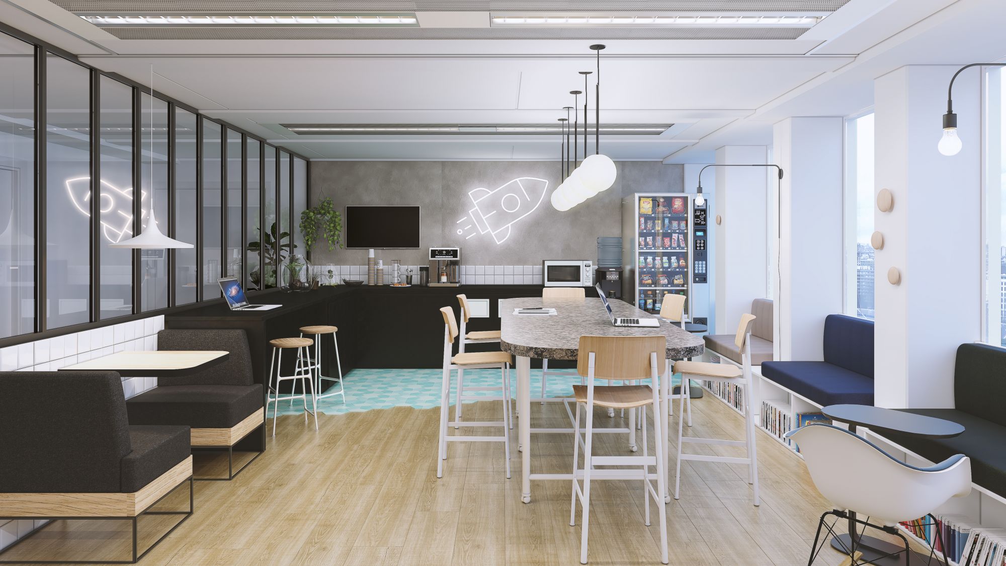 Petites tables avec fauteuils face à face façon Diner américain, table haute commune ou alcôves agencées devant les grandes fenêtres permettent de varier les positions selon les usages