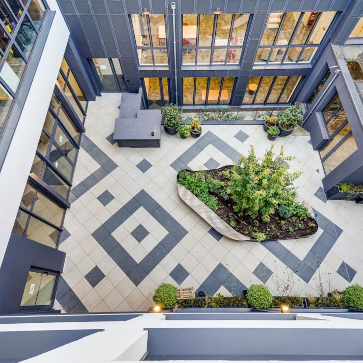 Le projet conçu par les agences Kardham Architecture et Vincent Lavergne Architecture et Urbanisme propose deux visages. Côté rue, le bâtiment se montre sobre, minéral, en cohérence avec l’architecture bioclimatique développée au sein des Fabriques où la qualité de vie est un pilier de la conception. Puis, à l’intérieur, l’ouvrage se déploie autour d’un patio central traversant, ouvert sur un vaste cœur d’îlot arboré, à l’abri des fortes chaleurs et du vent. Créant un cocon de lumière, ces espaces où l’on respire, contribuent à la qualité de vie au travail des collaborateurs. Les terrasses de travail, les bureaux et les espaces informels de rencontres offrent toutes les qualités d’un immeuble de bureaux contemporain.